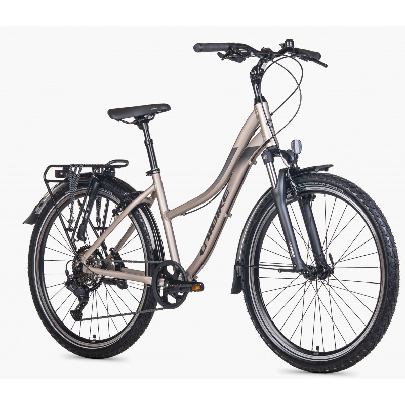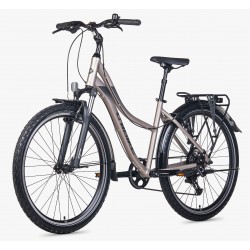 To model, który można określić jako solidny rower rekreacyjno-trekkingowy na mniejszych kołach 27.5". To świetna propozycja dla kobiet szukających stabilności i wygody, łącząca cechy roweru górskiego (szerokie opony) z komfortem mieszczucha (amortyzowana sztyca, regulowany mostek).