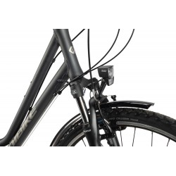 To klasyczny, w pełni wyposażony rower trekkingowy – idealny „mieszczuch” i kompan na długie, spokojne wyprawy. W przeciwieństwie do poprzednich modeli, mamy tu hamulce typu V-Brake i prądnicę w piaście, co czyni go niemal bezobsługowym w kontekście oświetlenia.